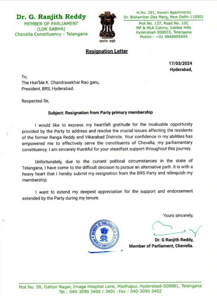 Speculation about Reddy’s potential move to the Congress party has been circulating for weeks, with several sources close to the MP suggesting an alignment with the party’s ideologies and vision. The official confirmation of his resignation from BRS and subsequent plans to join Congress has sparked a flurry of discussions among political observers and constituents alike.